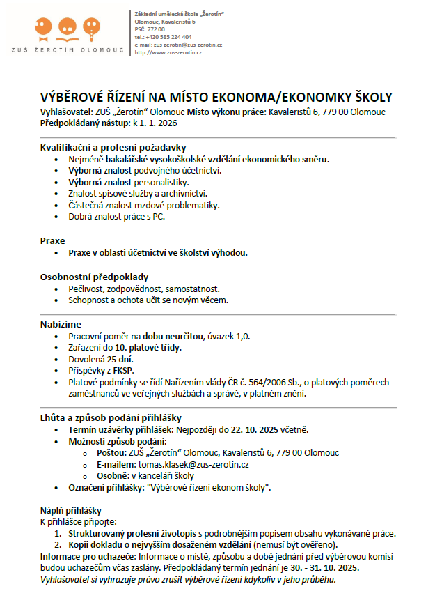Vyhlašovatel: ZUŠ „Žerotín“ Olomouc Místo výkonu práce: Kavaleristů 6, 779 00 Olomouc Předpokládaný nástup: k 1. 1. 2026